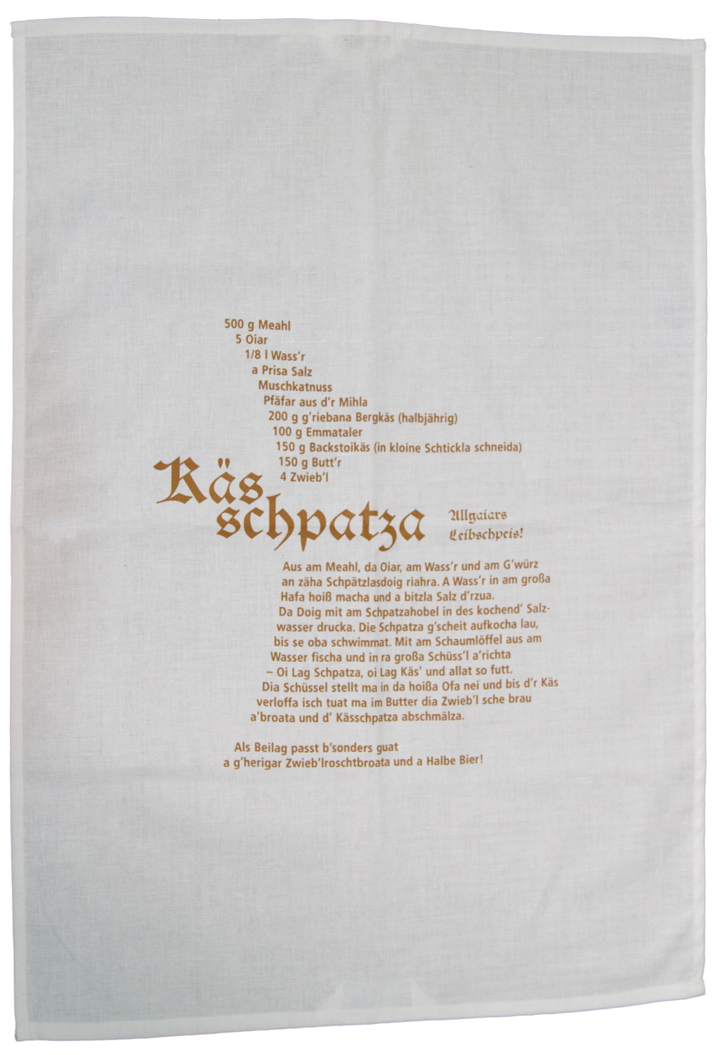 Geschirrtuch mit dem beliebten Allgaier Kässpatzen-Rezept. Tolle Geschenk-Idee, auch für nicht-Allgäuer!