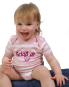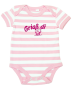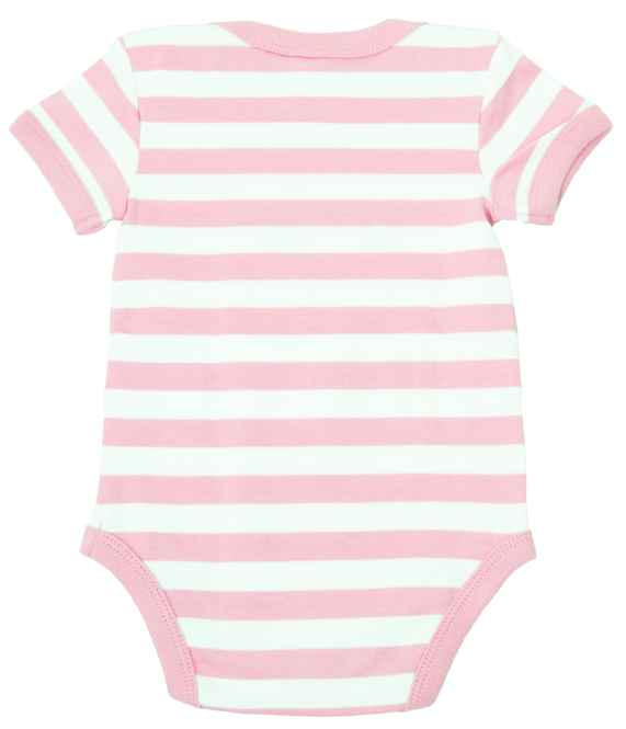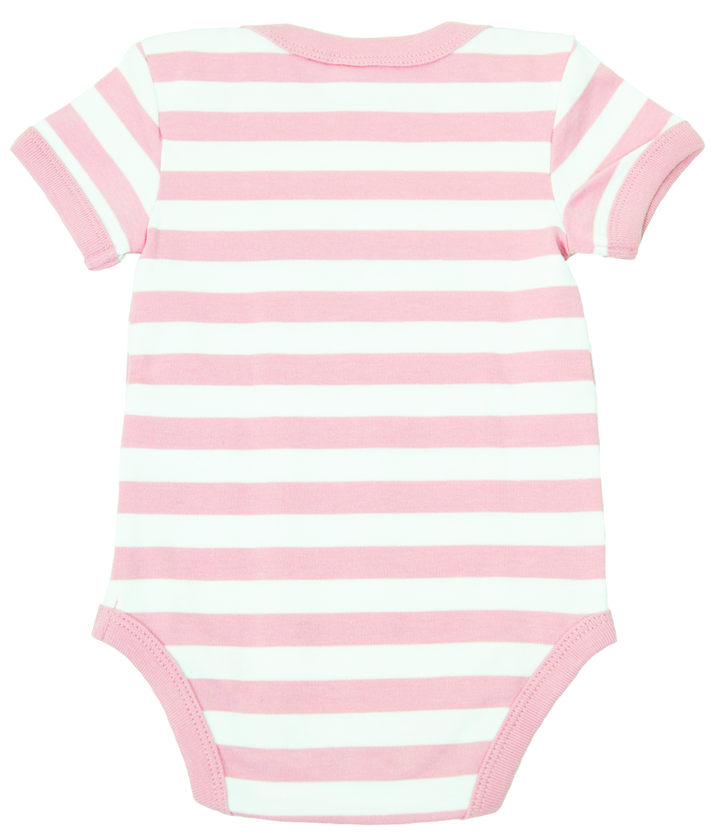 Baby-Kurzarm-Strampler aus weichem dehnbarem Interlock im Streifenlook. Überlappende Schultern und Druckknöpfe im Schritt, für einfaches Anziehen.